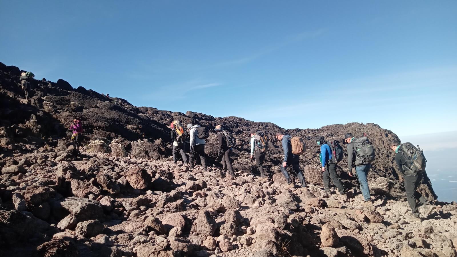 Terrain: Traverse rocky alpine desert as you approach the Kibo crater rim. The landscape is stark and barren, with increasing exposure to wind and cold temperatures.